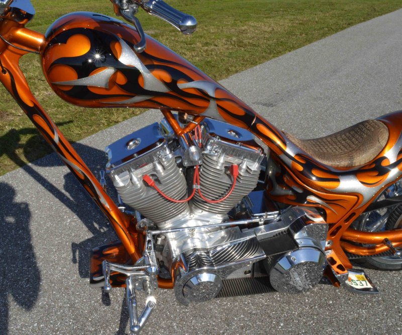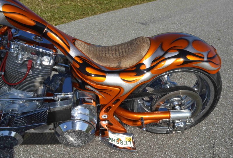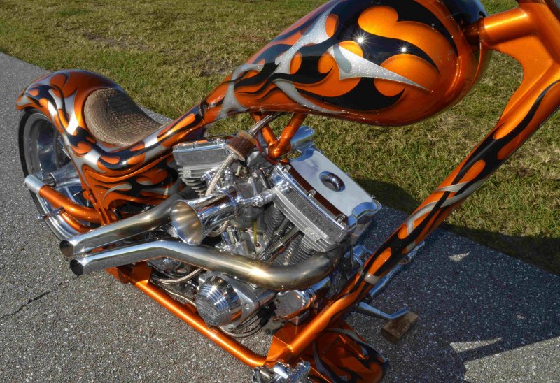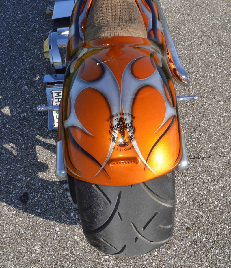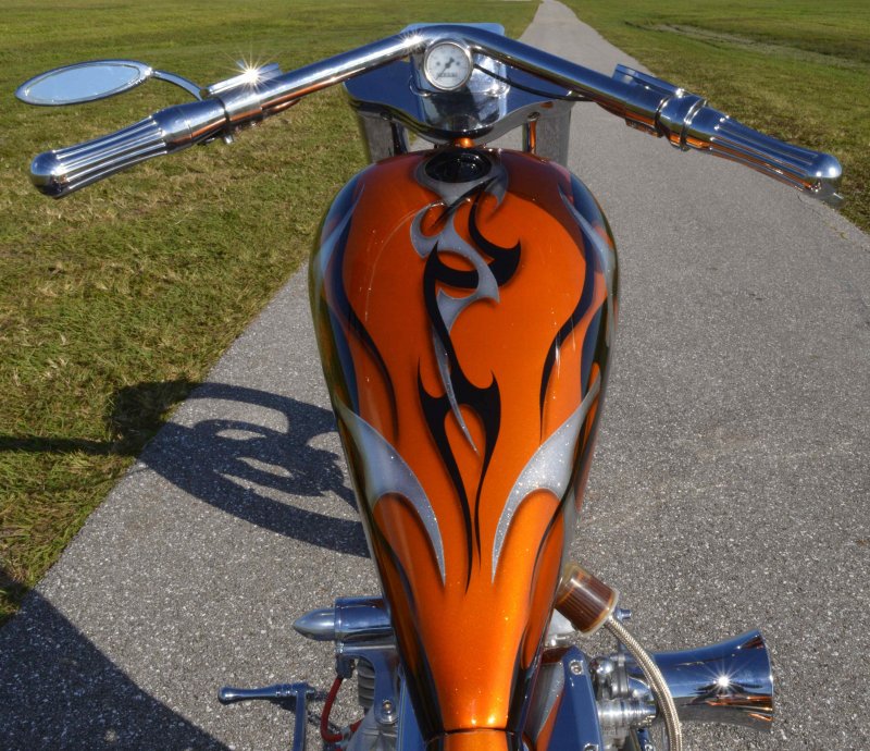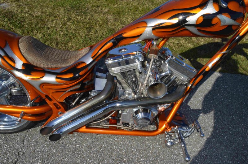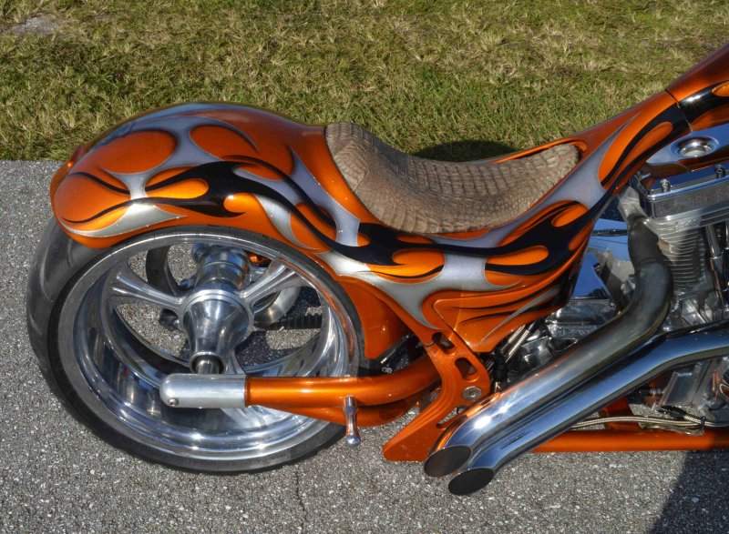 2004 EDDIE TROTTA S&S 125ci THUNDER CYCLE DESIGNS DROP SEAT SOFTAIL CHOPPER, Only 4,884 Miles, Excellent Mint Condition, Originally Sold For $65,000.00. Entire Bike has Many Eddie Trotta Chrome Accessories. Custom Paint Job by Chris {Bones} Tolson; Subdue Orange Metal Flake base paint with Gloss Black and Silver Metal Flake Tribal Blades Graphix, Frame is Painted Subdue Orange Metal Flake w/ Gloss Black and Silver Metal Flake Tribal Blades Graphix to Match. Show Polished S&S 125ci V-Twin Ground Pounding 2048cc Motor with Electronic Compression Releases, Chrome Heads, Baker 6 Speed Transmission, Primo 3.5-inch Open Belt Primary with Chrome Foot Cover, Frankie Cerano Chrome Dual Exhaust Pipes, S&S Super G Carb with Trotta Chrome Stack Air Intake, Chrome Trotta Thunder Cycle Points Cover, Trotta Chrome Oil Filter Cover, Trotta Hourglass Shift Linkage, Chrome Thunder Cycle Derby Cover, Chrome Starter. Chrome Performance Machine Wheels, 21-inch Front Wheel with Brand New Fat Metzler Tire, 18-inch Rear Wheel w/ a Brand New Fat 280mm Metzler Tire, Brand New Metzler Tires no miles on them. Chrome Handlebars and triple trees, Chrome American Suspension Inverted Front Forks, Trotta Chrome Hourglass Hand Grips, Performance Machine Chrome Hand Controls with Trotta Cross Covers, Internal Brake and Throttle Cables, Trotta low Profile Oval Mirror, 4 Gal Fuel Tank, Custom Jeffery Phipps Alligator Seat, Chrome Performance Machine Dual Piston Front Brake Caliper, Chrome Front Brake Disk Rotor, Chrome Performance Machine Rear Brake Caliper integrated with Pulley, Thunder Cycle Driver Chrome Hourglass Pegs, Trotta Chrome Billet Shift Arm and Brake Arm, Trotta Chrome Hourglass Brake and Shifter Pegs, Low Profile Chrome License Plate Frame with integrated LED brake light, Bad Ass Softail Bar Hopper, 20 inch Seat Height, low center of gravity. Only 4,884 Miles. Just Had Full Service: Brand New Metzler Tires front and rear, Oil Change w/ filter, New Battery, Carb Clean and Rebuild, Spark Plugs, Brake lines flushed. Runs Perfect. Super Clean Excellent Mint Condition. Asking $24,995.00. Call 561-252-7800 Bike Running on Youtube - https://youtu.be/41j5lWoRXlc