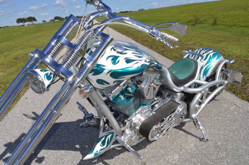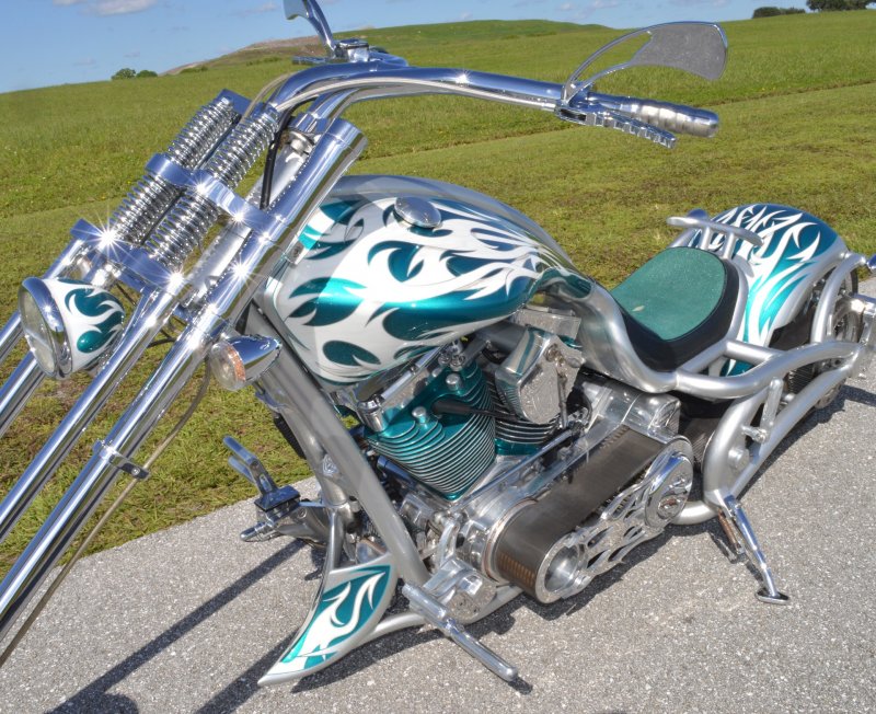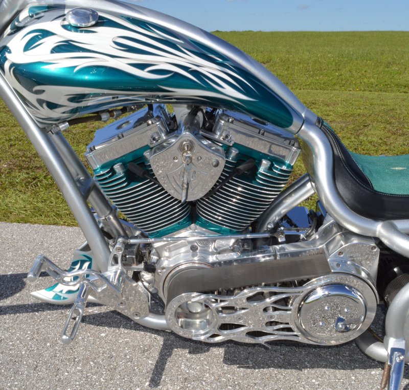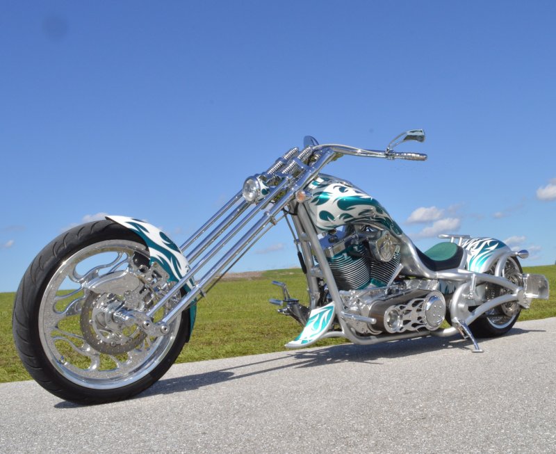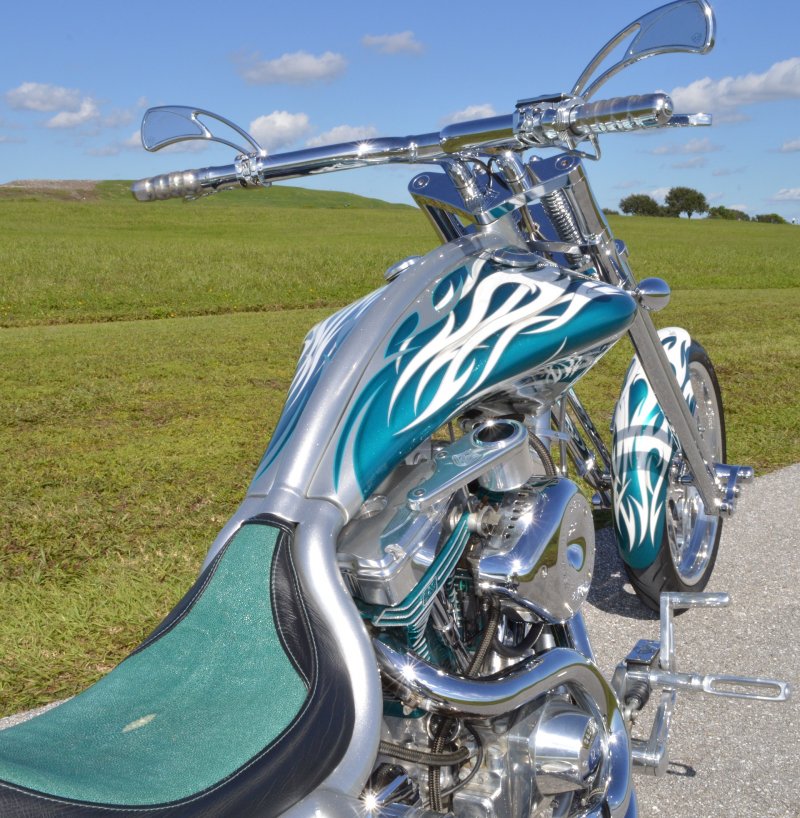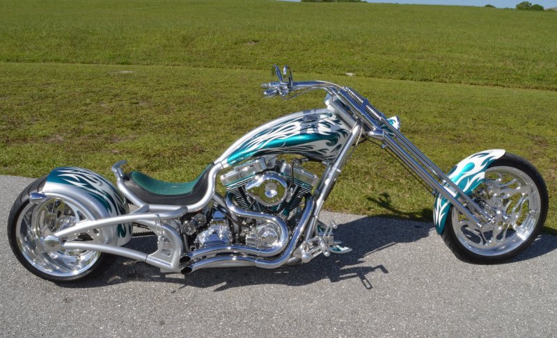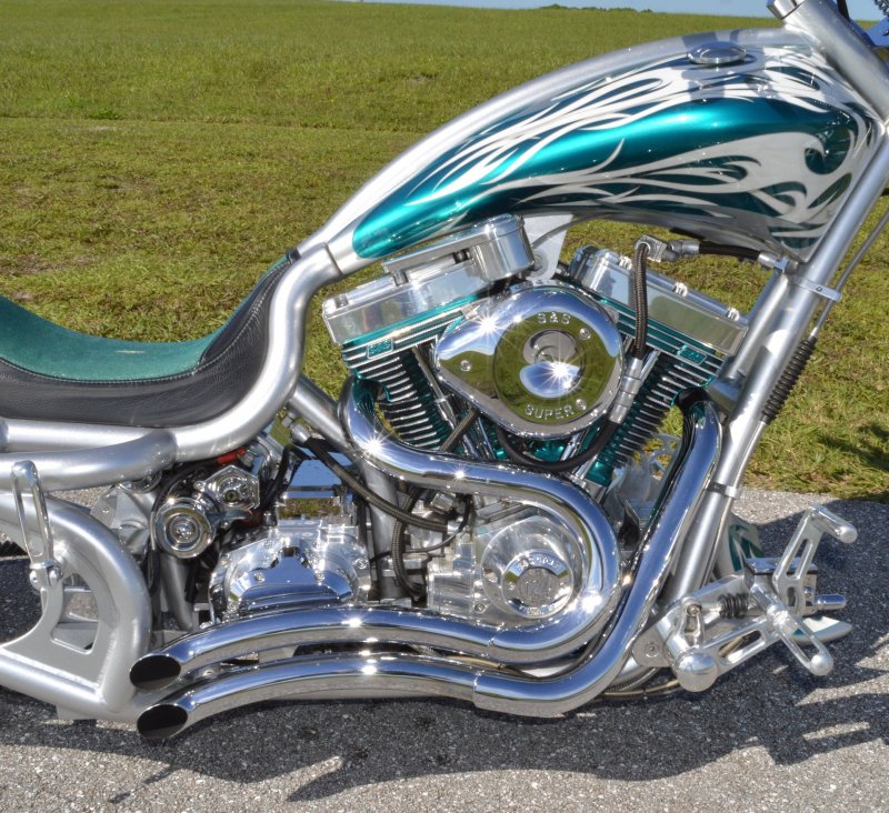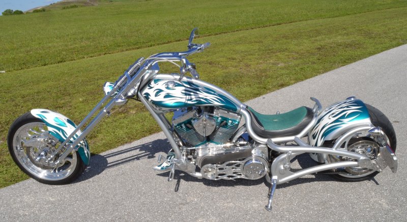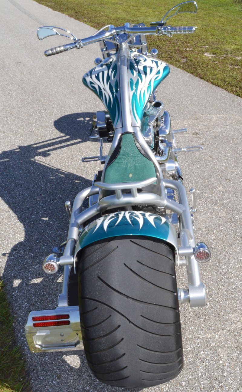 2010 BOURGET PYTHON SUPER STRETCH LIMO COBRA SPRINGER 330 REAR TIRE CHOPPER, Showroom Mint Condition. Only 10,145 Miles. New Style Super Stretch Frame with Optional Larger and Wider Cobra Split Fuel Tanks with Exposed Backbone with optional 6-inch Stretch Rear frame-arm with optional Retro Air Dam Painted to match. Custom Order Paint by Steel Visions: Kandy Teal Flake Base with Pearl Escalade White Devil Tail Flames All Covered in Many Layers of Clear Coat, Orion Silver Flake Frame, Complete Show Polish Package on Entire Bike. Optional 124ci S&S Engine 2032cc with an astounding 148HP, Optional Diamond Cut Jugs with Kandy Teal Powdercoat, BBW Show Polished Rocker Boxes, Jims Fat 5 Overdrive 6 Speed Transmission, Optional Primo Brute V 3-1/2 inch Open Belt Primary with a Bourget Cut Out Flames Belt Guard, BBW Swoopies True Dual Exhaust Pipes w/ Chrome Heat Shields, Show Polished Inner Primary, Twin Cam Ignition Charging System, Chrome S&S Air Cleaner Cover, electronic compression releases. Pyromaniac Show Polished Billet Wheels, Optional 17 X 12 inch Rear Wheel w/ Brand New Fat Avon 330mm Rear Tire, Optional 21 X 3 ½ inch Front Wheel w/ Fat 120/90/21 Avon Tire in Excellent Condition, Matching Pyromaniac Pulley & Pyromaniac Brake Rotor Discs. Optional Chrome BBW Springer Front End 47 Degree Rake with Chrome Springs, Chrome Chopper Handlebars, Show Polished BBW Hand Controls with BBW Slotted brake and clutch Levers, Optional Chrome Rocker Switch Controls, BBW Billet Hand Grips, Diamondback SS Stainless Steel Brake, Clutch and Throttle Cables, BBW Billet Polished Mirrors, Chrome Headwinds 4.5-inch Headlight Painted to match. Optional Black Leather and Teal Stingray Solo Seat with Limo Grab Bars, Low Center of Gravity 24-inch Seat Height, BBW Slotted Foot Pegs for Driver and Passenger, Show Polished BBW solid Brake and Foot Shift Leavers, Show Polish Front and Rear Dual 6 Piston Brake Calipers, Optional Rear Brake Rotor and Belt Drive Pulley, Chrome BBW Kickstand. Dakota Digital Speedometer/Odometer BBW Side Mount to Rockerbox, Chrome Bullet Turn Signals w LED Lights, Chrome BBW Side License Plate Bracket w LED Lighting. {I have in Hand Original Build Sheet from BOURGET BIKE WORKS showing all Parts and Options, Original MSRP $60,775.00} Just Went through Service For: Safety Check, Brand New Avon 330mm Rear Tire, Carb clean with new seals and jets, Brakes flushed and Serviced, Fresh Motor Oil and Filter, New Battery with tender tail. Only 10,145 Miles. Chopper Runs Perfect and is in Excellent Showroom Condition. $34,995.00, Please Call 561.252.7800 To Schedule an Appointment to See this Bike. Bike Running on Youtube - https://youtu.be/XQcqCn3Zp_c