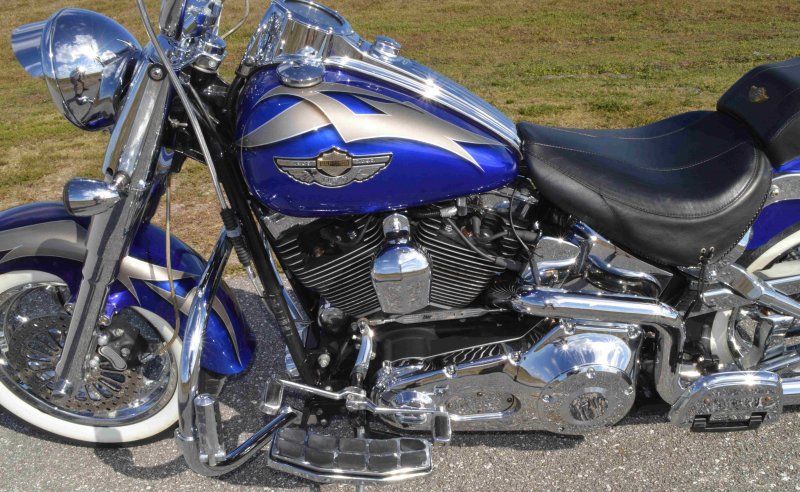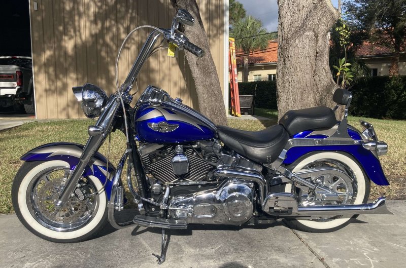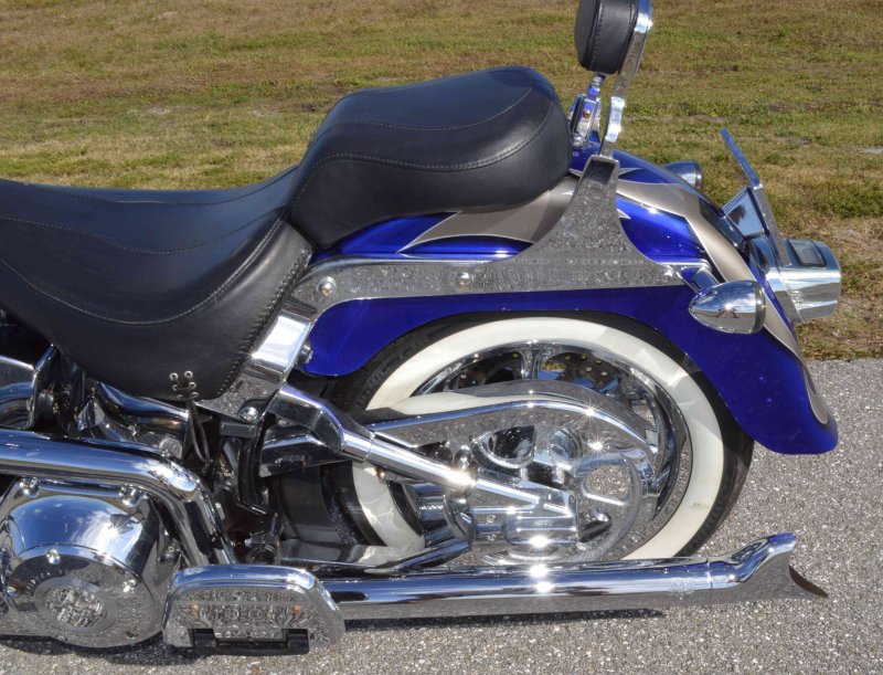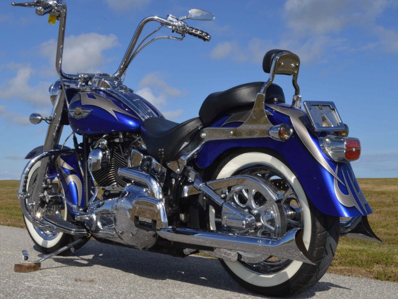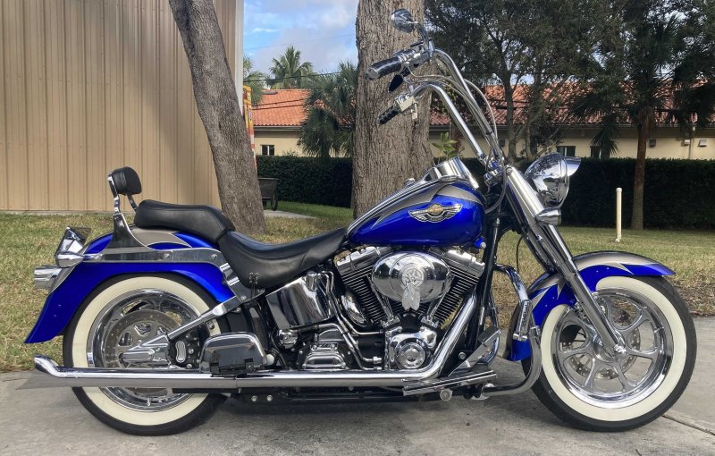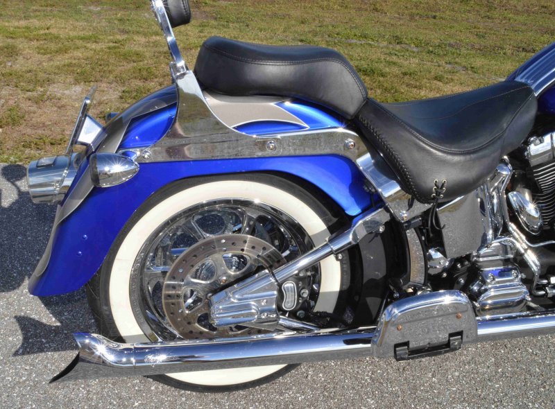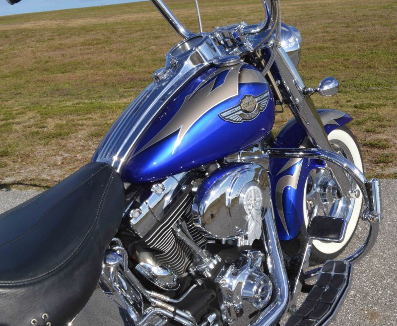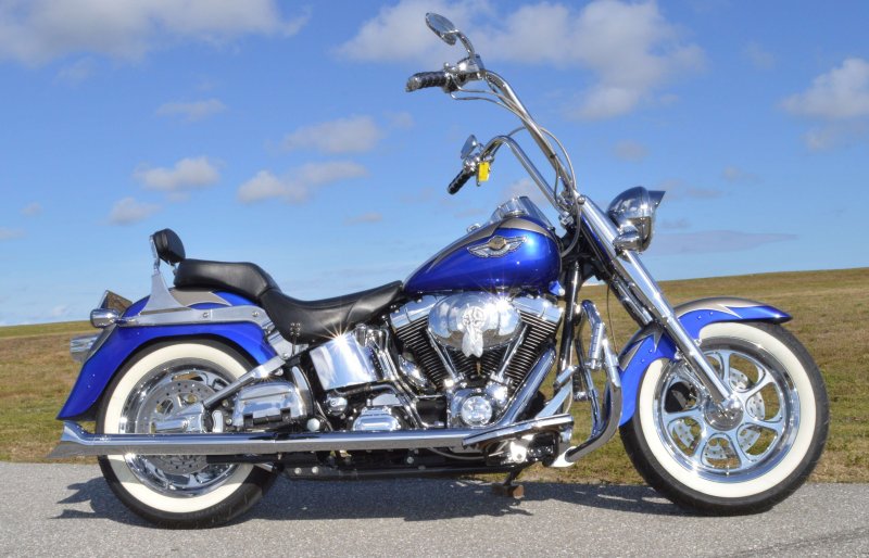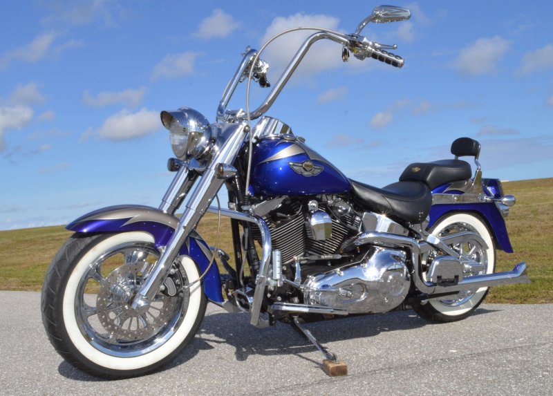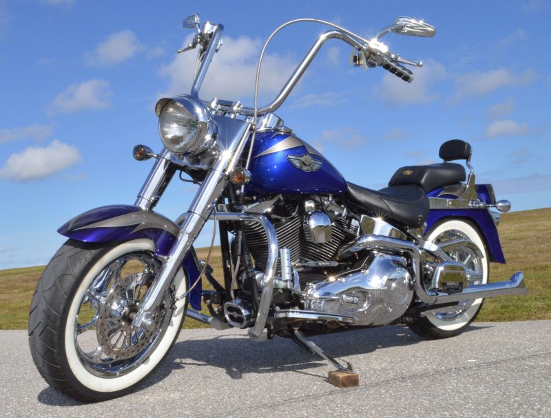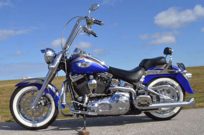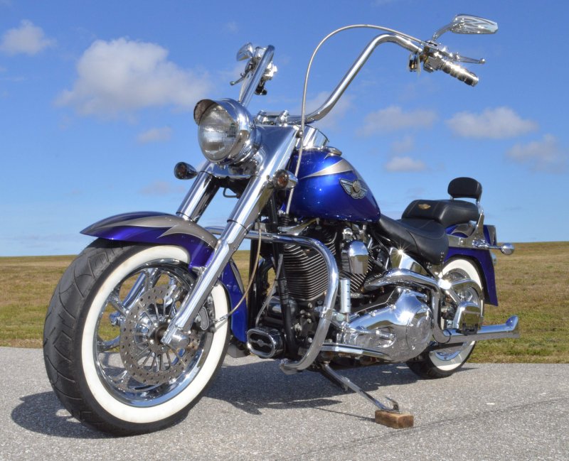 2003 HARLEY DAVIDSON 100th ANNIVERSARY FATBOY SOFTAIL EFI FLSTFFI, Mint Showroom Condition. Over $10,000 in Extras: Paint Work + Harley Parts and Chrome Extras. Always kept in a climate-controlled Garage. Custom Paint Job Cobalt Blue Base with Silver Pearl Tribal Blade Graphix, EFI Electronic Fuel Injection, 1450cc Big Twin, Chrome 5 Spd Transmission, Chrome Vance and Hines True Dual Fish Tail Pipes, Chrome 100th Ann Derby Cover, 100th Anniversary Chrome Air Cleaner Cover with cool Indian Feather Accents, Chrome Timer Cover, Chrome Primary, Chrome Harley Davidson Script Shifter Linkage, Chrome Oil Tank. Entire Front End is Chrome including Lower Legs and Cans and Tripple Trees, Chrome Headlight with Side Markers, Chrome Fatty Ape Handle Bars, Chrome HD Teardrop Mirrors, Chrome Hand Controls Switch Housings, Chrome Brake & Clutch Leavers, Diamondback Stainless Steel Braided Cables, Chrome and Rubber ISO Hand Grips, CVO Chrome Tank Console and Ignition Switch Cover, Chrome Engine Guard with chrome touring highway floorboards and stash tube, 5 gallon fuel tank with 100th Anniversary Winged Logos, Passenger Seat with 100th Anniversary Badging with Shorty HD Backrest, Touring Driver Leather Seat, Brand New Fat Gangster White Wall Tires, Chrome HD Billet Wheels and matching Pully and brake rotors, Chrome and Rubber Floor Boards, Chrome Covered Rear Floor Boards, Chrome Layback Tag Bracket, Chrome Smoke Rear Tail-light, Chrome Covers on Softail Swingarm, Chrome Belt Pulley, Chrome Horn Cover, Only 30,822 miles. Just Had Full Service: Brand New Tires front and rear, Oil Change w/ filter, New Battery, EFI Flushed, Spark Plugs, Brake lines flushed. This Amazingly Clean Bike Runs Perfect and is Mint Showroom Condition. $9,995.00, Please Call 561.252.7800 to schedule appointment to see this one. view this running on youtube https://youtu.be/MMIplMOVHAI