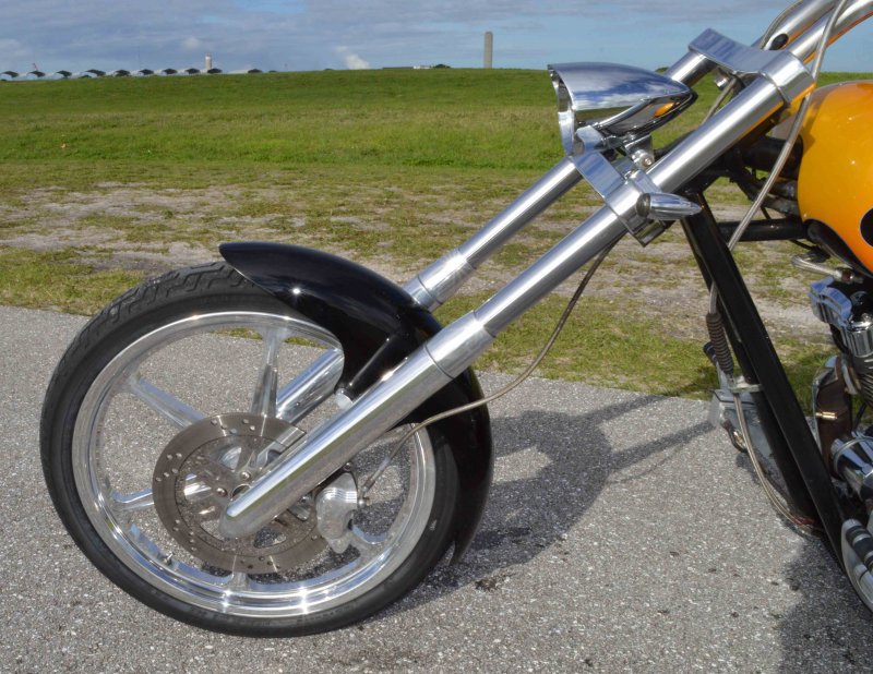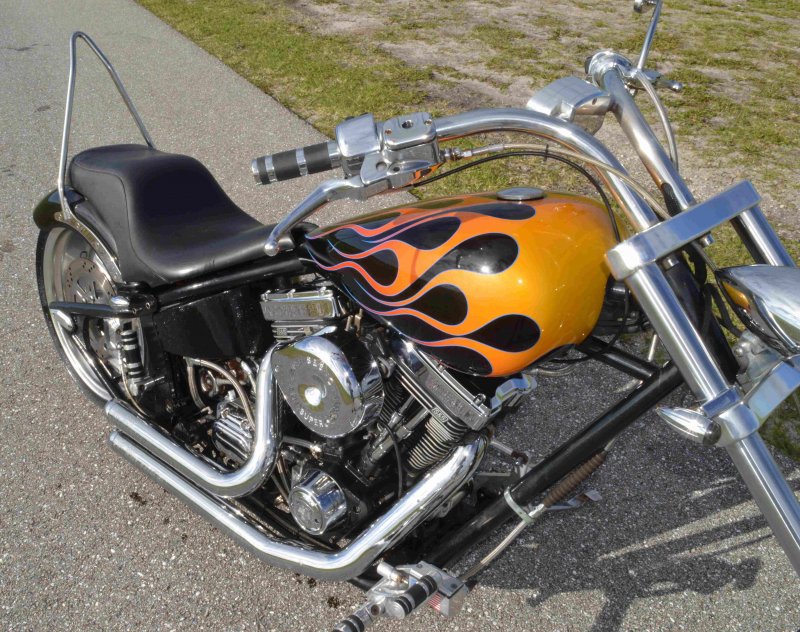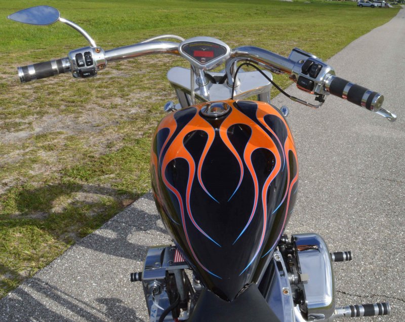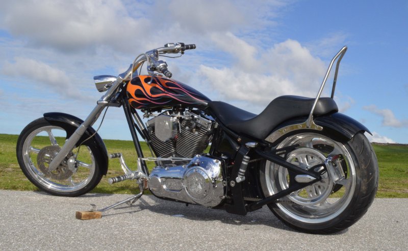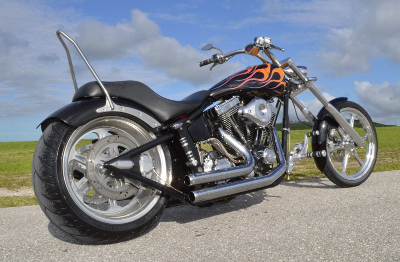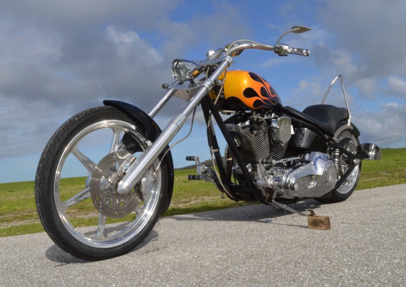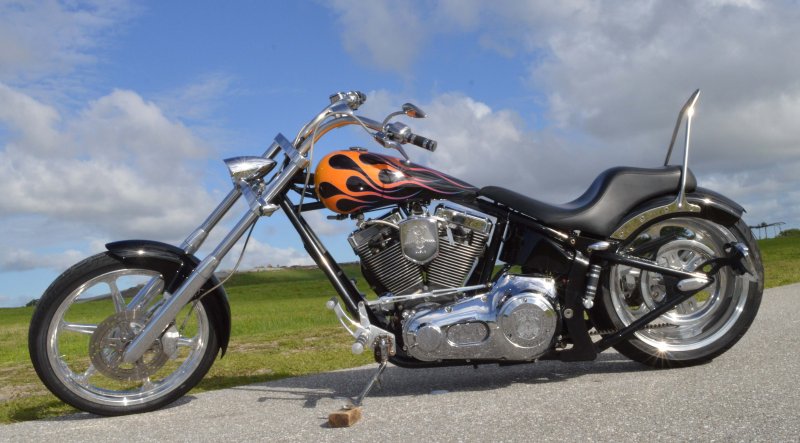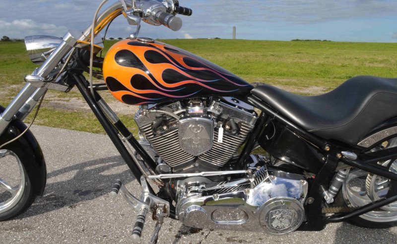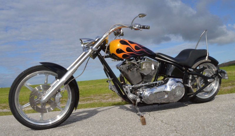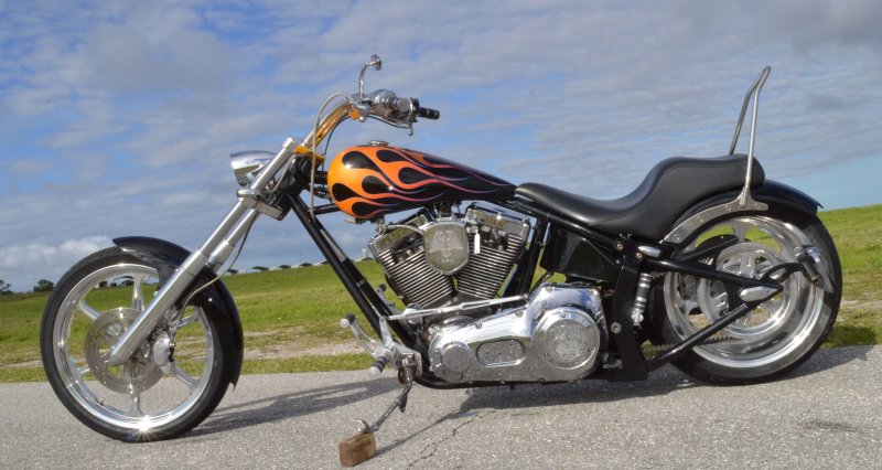 2005 SAXON FIRESTORM 260 SOFTAIL CHOPPER, Excellent Condition. Gloss Black with Orange and Red Flames Paint Job, S&S V-Twin 1573cc Motor, with Chrome Rinehart Bub Large Radius Dual Pipes, Chrome S&S Teardrop Air Cleaner w Screamin Eagle Breather, Chrome Rocker Boxes w lids, Chrome Inner Primary, Chrome Outer Primary, Chrome Primary Derby Cover, 6 Speed Transmission. Chrome Front End, Chrome Headlight with LED Daylighter headlamp, Low Profile Chrome Bullet Turn Signals, Chrome Pullback Handlebars, Chrome Hand Controls, Chrome Switch housings, Chrome and Rubber Billet Grips, Chrome Brake and Clutch Levers, SS Diamondback Stainless Steel Brake, Clutch, Throttle Cables. RC Show Polished Aluminum Billet Wheels, Matching Show Polished Front & Rear Brake Rotors, Front & Rear H-D Dual Piston Chrome Brake Calipers, 85% Excellent Condition Avon Tires, 21 inch Front, 260mm Rear Tire, 5 Gallon fuel tank, 25 inch Seat Height, 2-up Seat, Rear Passenger Chrome Sissy Bar, low center of gravity with Chrome Progressive Softail Suspension Shocks, Show Polished Aluminum Billet and Rubber Foot pegs, Show Polished Aluminum Billet Brake & Shift Leavers, Black Oil Tank. Only 22,741 Miles, Very Well Maintained, Just Went through Service for: Safety Inspection, Carburetor cleaned with entire re-build kit, Fresh Oil Change and Filter, Brake Lines Flushed then new fluid, New Battery with tender tail, Excellent Condition. $8,995.00, Please Call 561.252.7800 to make Appointment to see this bike. Bike Running on Youtube - https://youtu.be/-8o1lk46sP8