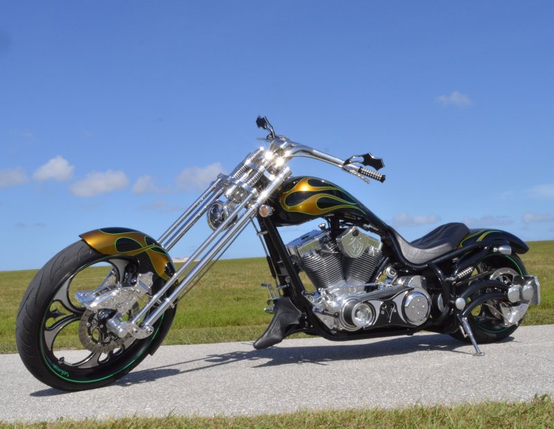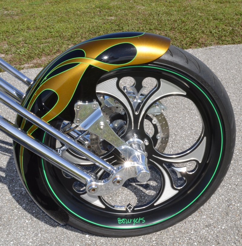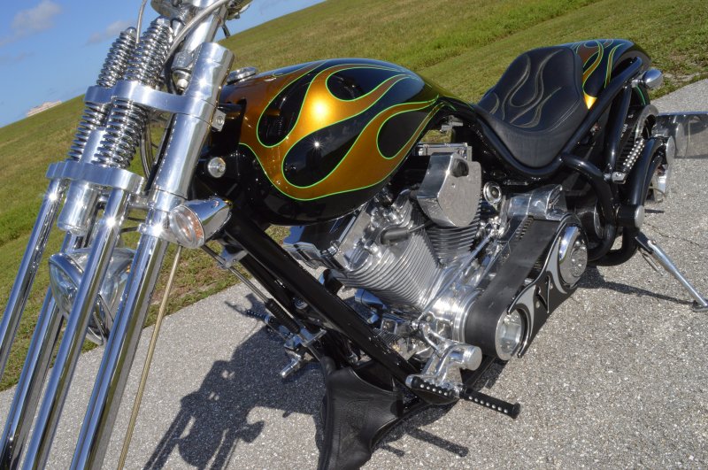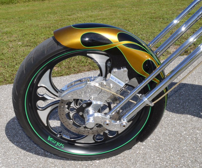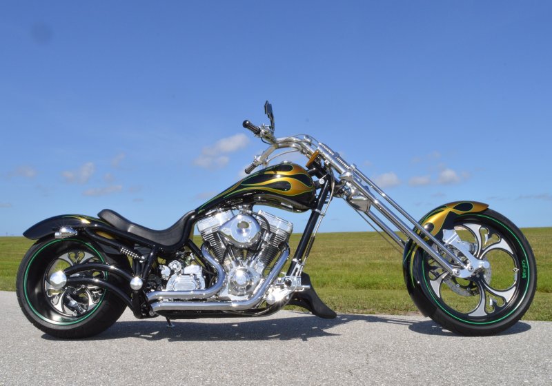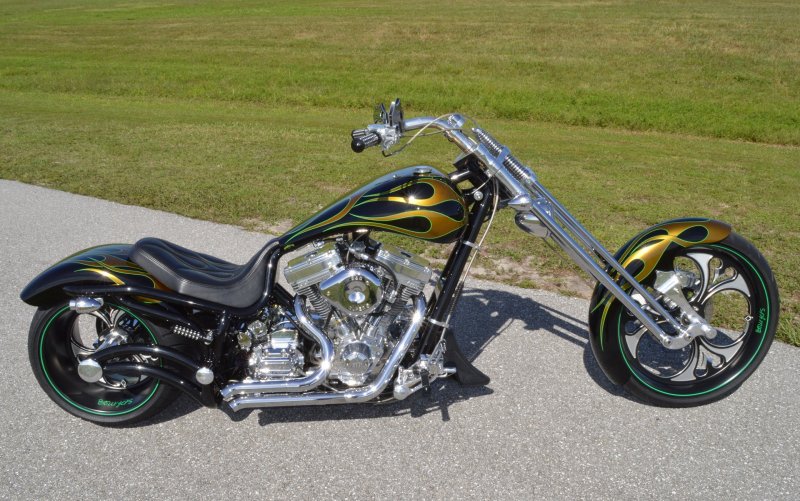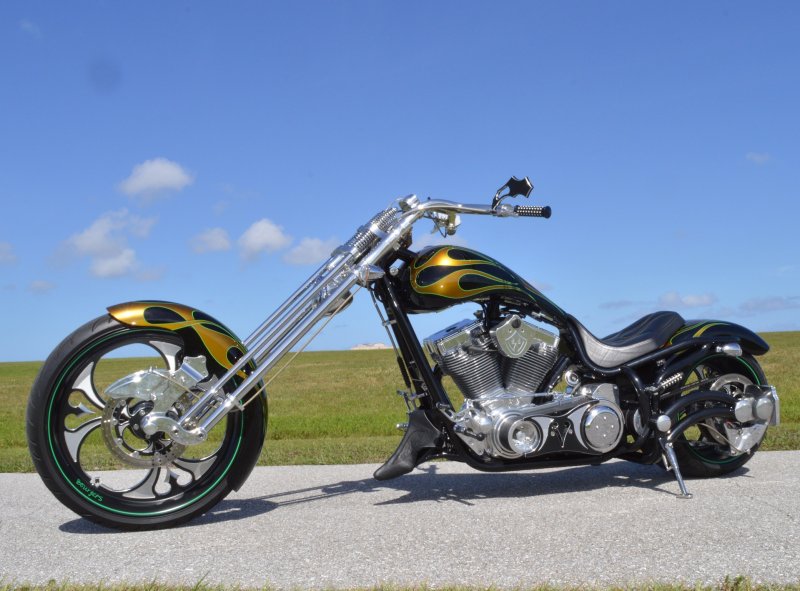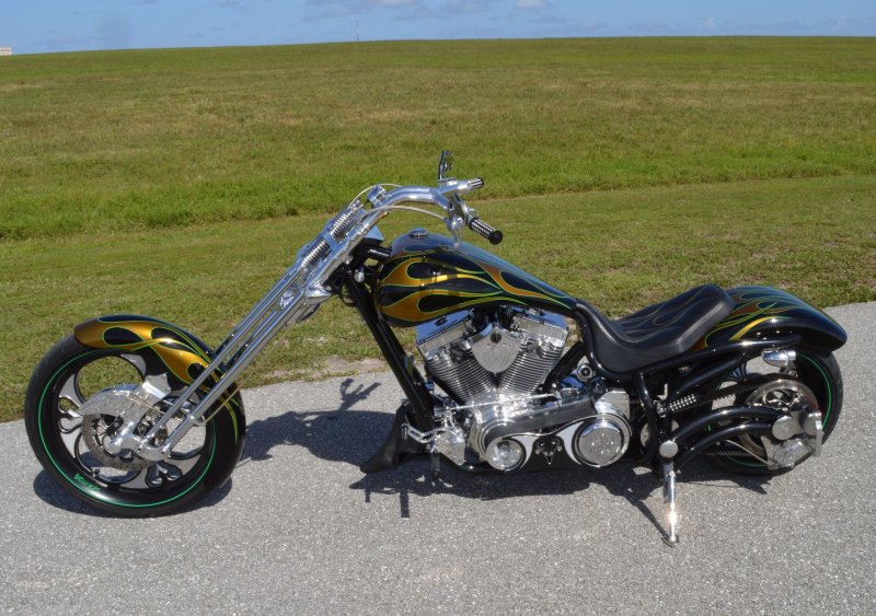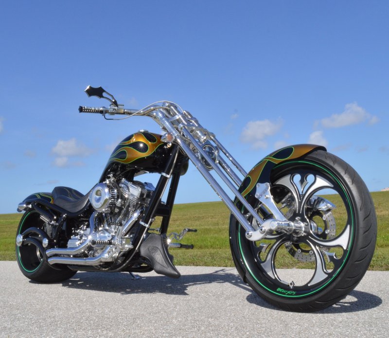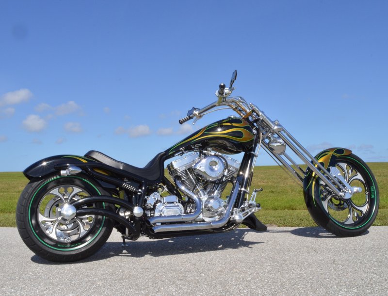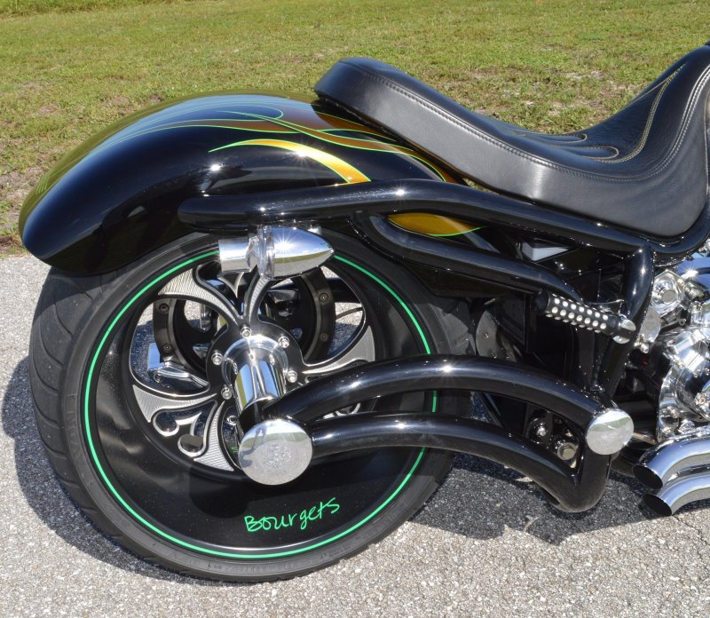 2013 BOURGET BIKE WORKS FAT DADDY SPRINGER 330 SOFTAIL BIG WHEEL CHOPPER, Only 5,326 Miles. Excellent Showroom Mint Condition. VERY Custom Big Wheel Fat Daddy Springer, 23-inch Big Wheel Front Tire + Massive 330mm Rear, Custom Painted by Sinthium Inc. Gloss Black with 24K Gold Pearl Hot Rod Style Flames with Lime Green Pinstripes All Covered in Many Layers of Clear Coat, Powder Coat Frame. Complete Chrome Show Polish Package. Optional Show Polished S&S 117ci Solid Billet 1917cc Engine with Bourget Signature Embossed Chrome Heads, JIMS Overdrive 6 Speed Transmission,, simply the strongest tranny on the market built for a large cc motor, Optional Primo Brute 3 inch Open Belt Primary with a Trilogy II Contrast Cut Belt Guard, Show Polished Inner Primary, Custom Shorties Dual Exhaust, Diamondback SS Stainless Steel Oil Lines, Twin Cam Ignition Charging System, Chrome SS Teardrop Air Cleaner Cover. BBW Trilogy II Contrast Cut Black and Aluminum Billet Wheels that both have Lime Green Pinstriping with BOURGETS Script Lettering, Matching BBW Contrast Cut Black and Aluminum Pulley & Brake Discs, Huge 23-inch by 3.5-inch Brand New Avon Front Tire, Massive 330mm Brand New Avon Rear Tire. Optional Chrome Springer Front End, Chrome Billet Headlight, Chrome V-Bar Handlebars w Wires Run Inside, Contrast Cut Black and Aluminum BBW Mirrors, Holy Roller Contrast Cut Black and Aluminum Hand Grips, Show Polish Hand Controls, Show Polish Switch housings, SS Diamondback Stainless Steel Brake, Clutch & Throttle Cables. 6 Gallon fuel tank, Seat is Leather With Exotic Alligator Skin Inserts with green and gold flame stitching, Low Center of Gravity 24 inch Seat Height, Also Includes Matching Passenger Seat With Matching Bra for the Retro Air Dam, Holy Roller Contrast Cut Black and Aluminum Foot Pegs for Driver and Passenger, Show Polish Brake & Shift Leavers, Show Polish Front & Rear Dual Piston Brakes, Softail Ace 330 rear swingarm with Dual Progressive Shocks, Chrome Kickstand, Digital & Odometer Speedometer and Tachometer, {I have Original Build Sheet from BOURGET BIKE WORKS showing all parts and options this bike was built with, so much more that I have listed. {COST $55.750.00 NEW} You Simply won’t find another 330mm Rear Tire Bad Ass Custom Chopper Like This. Only 5,326 Miles, Just Went through Service For: Safety Check, Brand New Avon Tires front and rear, Brand New BBW Drive Belts, Carb clean with new seals and jets, Brakes flushed and Serviced, Fresh Motor Oil and Filter, New Battery with tender tail. Excellent Showroom Mint Condition. Please Call 561.252.7800 Bike Running on Youtube - https://youtu.be/YR-ObIcVq7s