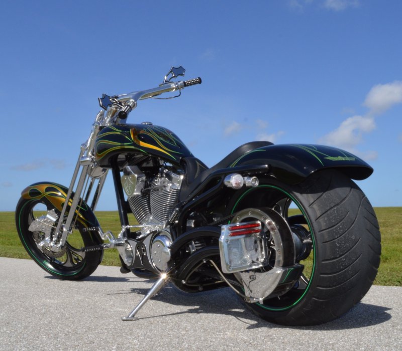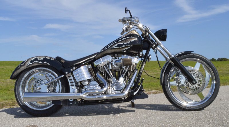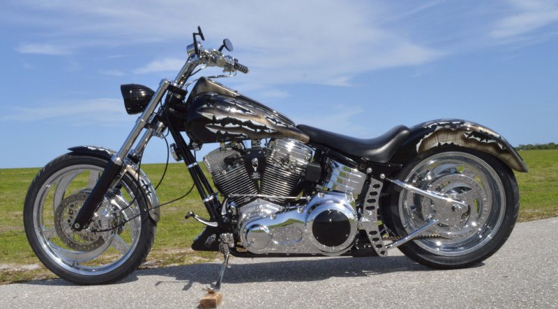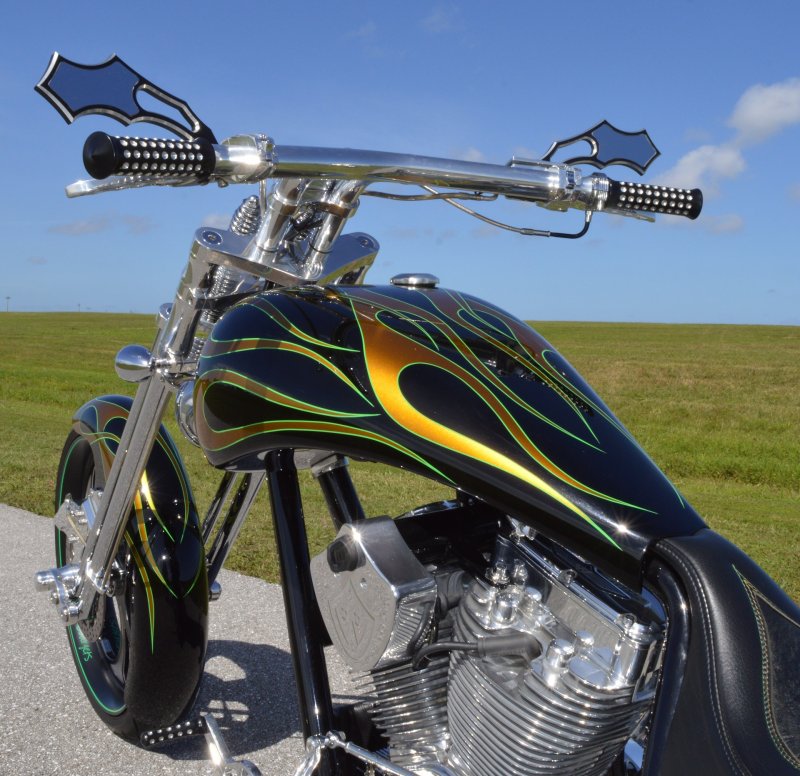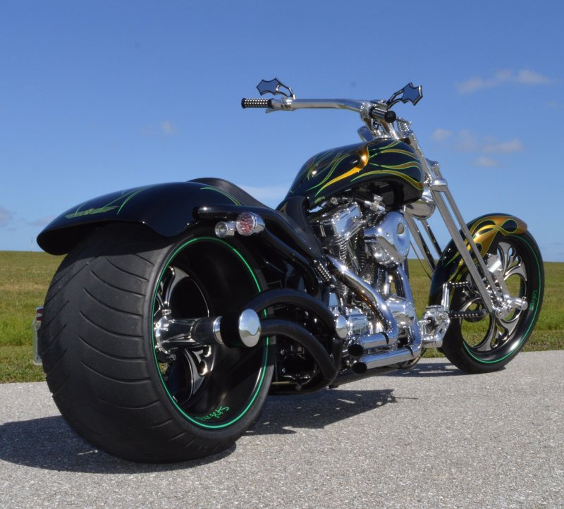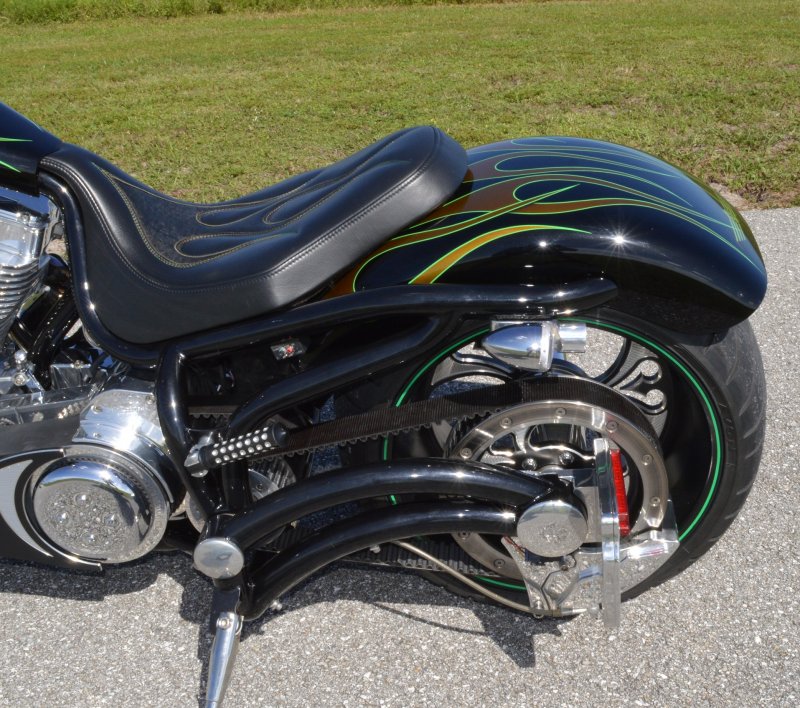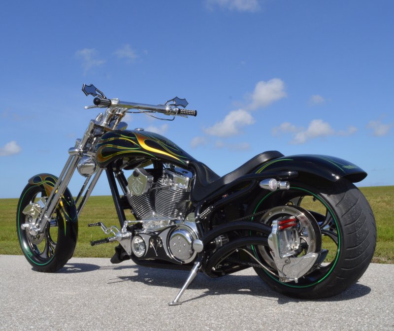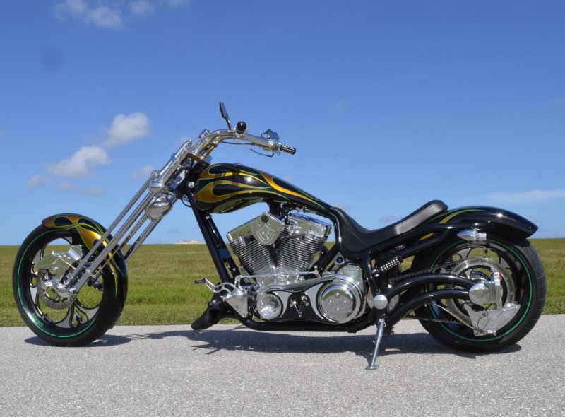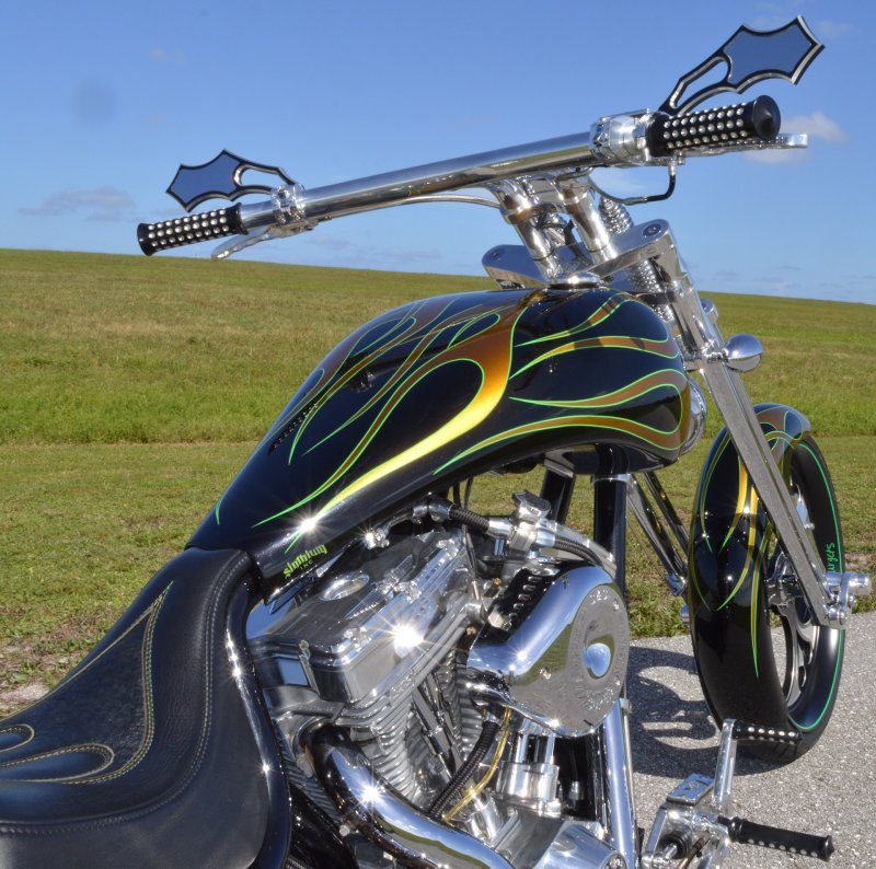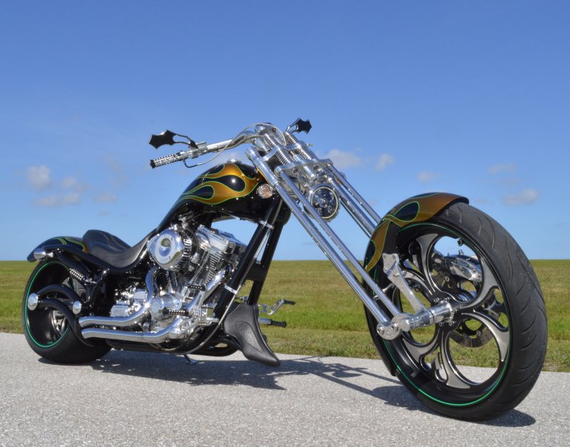 2013 BOURGET BIKE WORKS FAT DADDY SPRINGER 330 SOFTAIL BIG WHEEL CHOPPER, Only 5,326 Miles. Excellent Showroom Mint Condition. VERY Custom Big Wheel Fat Daddy Springer, 23-inch Big Wheel Front Tire + Massive 330mm Rear, Custom Painted by Sinthium Inc. Gloss Black with 24K Gold Pearl Hot Rod Style Flames with Lime Green Pinstripes All Covered in Many Layers of Clear Coat, Powder Coat Frame. Complete Chrome Show Polish Package. Optional Show Polished S&S 117ci Solid Billet 1917cc Engine with Bourget Signature Embossed Chrome Heads, JIMS Overdrive 6 Speed Transmission,, simply the strongest tranny on the market built for a large cc motor, Optional Primo Brute 3 inch Open Belt Primary with a Trilogy II Contrast Cut Belt Guard, Show Polished Inner Primary, Custom Shorties Dual Exhaust, Diamondback SS Stainless Steel Oil Lines, Twin Cam Ignition Charging System, Chrome SS Teardrop Air Cleaner Cover. BBW Trilogy II Contrast Cut Black and Aluminum Billet Wheels that both have Lime Green Pinstriping with BOURGETS Script Lettering, Matching BBW Contrast Cut Black and Aluminum Pulley & Brake Discs, Huge 23-inch by 3.5-inch Brand New Avon Front Tire, Massive 330mm Brand New Avon Rear Tire. Optional Chrome Springer Front End, Chrome Billet Headlight, Chrome V-Bar Handlebars w Wires Run Inside, Contrast Cut Black and Aluminum BBW Mirrors, Holy Roller Contrast Cut Black and Aluminum Hand Grips, Show Polish Hand Controls, Show Polish Switch housings, SS Diamondback Stainless Steel Brake, Clutch & Throttle Cables. 6 Gallon fuel tank, Seat is Leather With Exotic Alligator Skin Inserts with green and gold flame stitching, Low Center of Gravity 24 inch Seat Height, Also Includes Matching Passenger Seat With Matching Bra for the Retro Air Dam, Holy Roller Contrast Cut Black and Aluminum Foot Pegs for Driver and Passenger, Show Polish Brake & Shift Leavers, Show Polish Front & Rear Dual Piston Brakes, Softail Ace 330 rear swingarm with Dual Progressive Shocks, Chrome Kickstand, Digital & Odometer Speedometer and Tachometer, {I have Original Build Sheet from BOURGET BIKE WORKS showing all parts and options this bike was built with, so much more that I have listed. {COST $55.750.00 NEW} You Simply won’t find another 330mm Rear Tire Bad Ass Custom Chopper Like This. Only 5,326 Miles, Just Went through Service For: Safety Check, Brand New Avon Tires front and rear, Brand New BBW Drive Belts, Carb clean with new seals and jets, Brakes flushed and Serviced, Fresh Motor Oil and Filter, New Battery with tender tail. Excellent Showroom Mint Condition. Please Call 561.252.7800 Bike Running on Youtube - https://youtu.be/YR-ObIcVq7s
