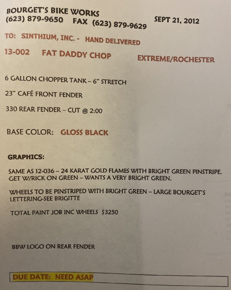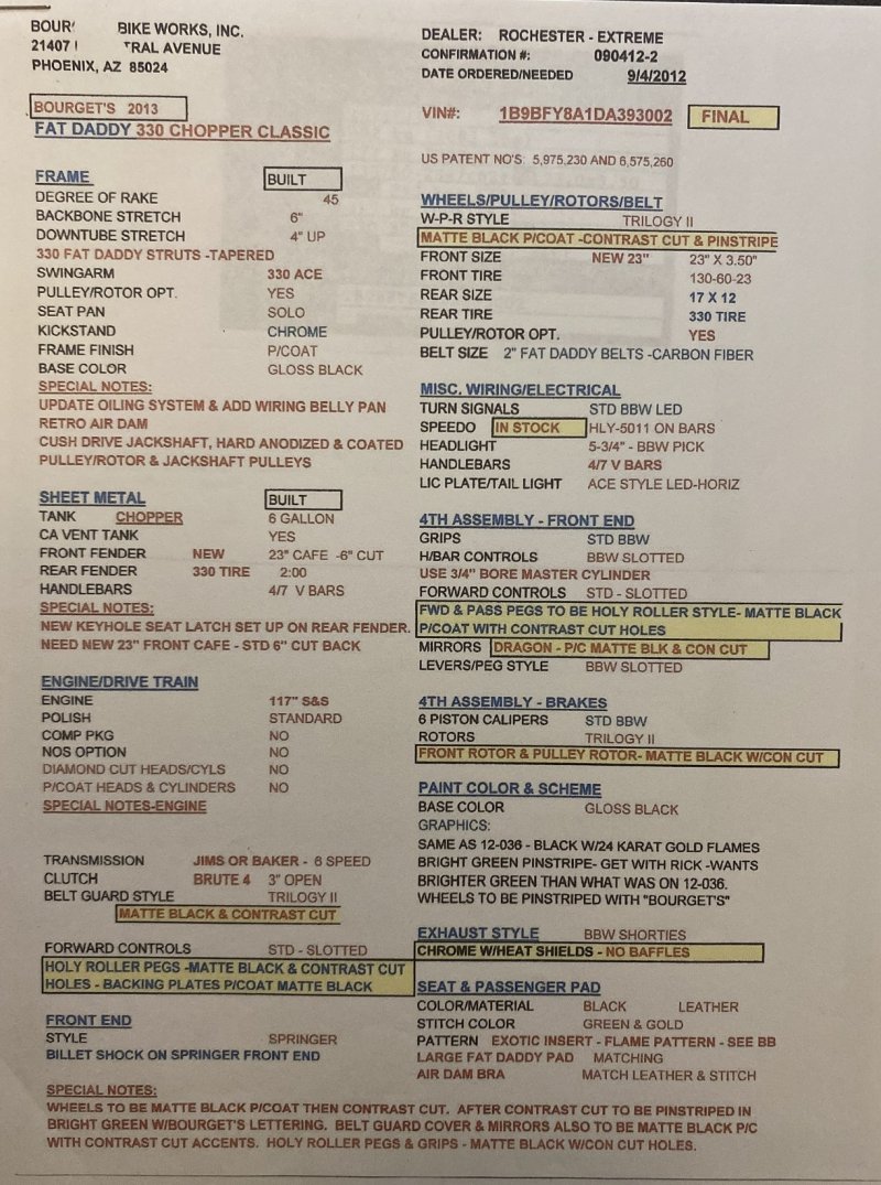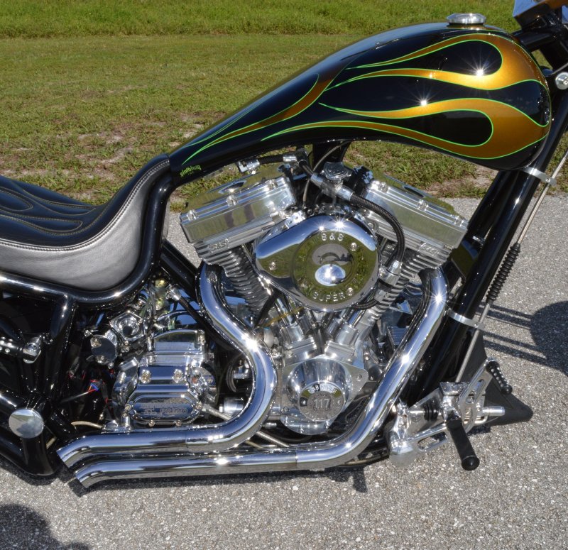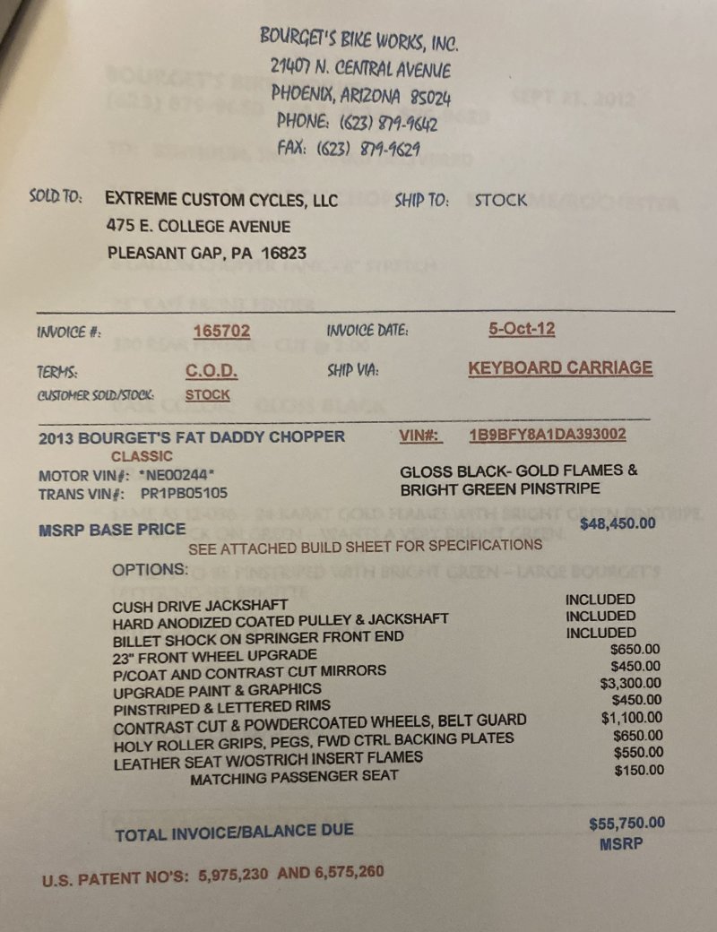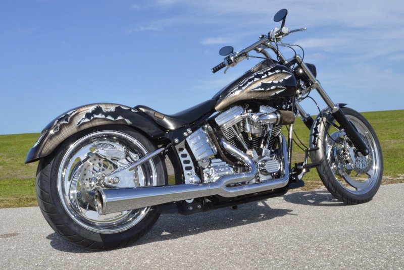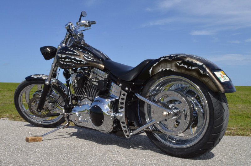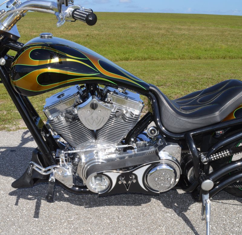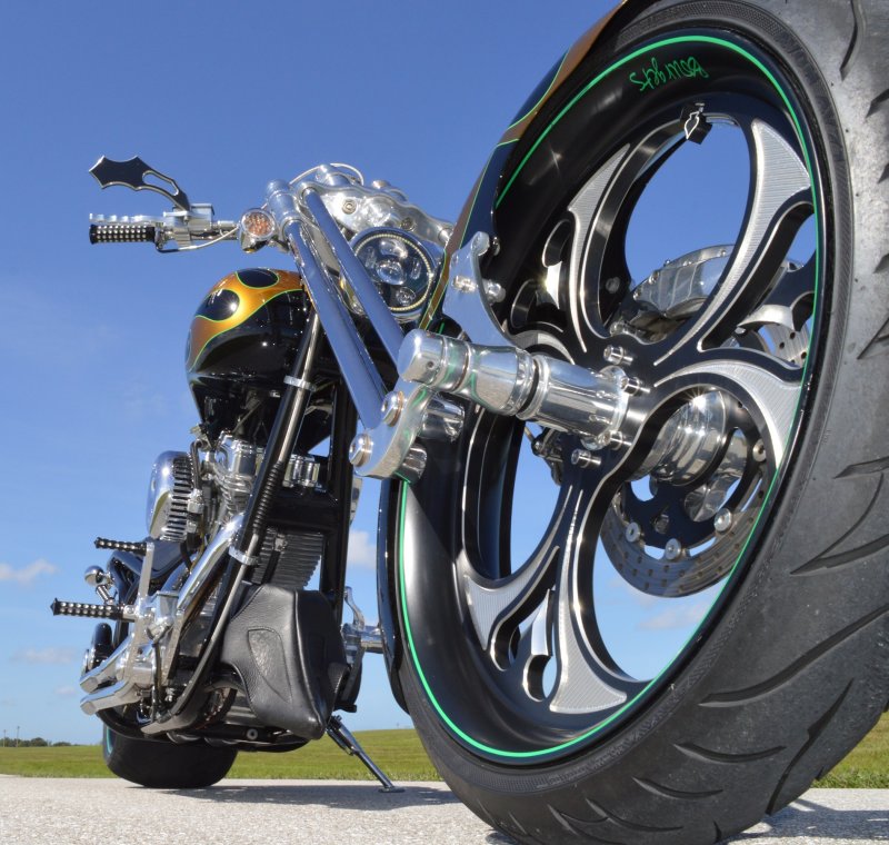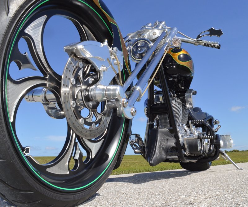 2013 BOURGET BIKE WORKS FAT DADDY SPRINGER 330 SOFTAIL BIG WHEEL CHOPPER, Only 5,326 Miles. Excellent Showroom Mint Condition. VERY Custom Big Wheel Fat Daddy Springer, 23-inch Big Wheel Front Tire + Massive 330mm Rear, Custom Painted by Sinthium Inc. Gloss Black with 24K Gold Pearl Hot Rod Style Flames with Lime Green Pinstripes All Covered in Many Layers of Clear Coat, Powder Coat Frame. Complete Chrome Show Polish Package. Optional Show Polished S&S 117ci Solid Billet 1917cc Engine with Bourget Signature Embossed Chrome Heads, JIMS Overdrive 6 Speed Transmission,, simply the strongest tranny on the market built for a large cc motor, Optional Primo Brute 3 inch Open Belt Primary with a Trilogy II Contrast Cut Belt Guard, Show Polished Inner Primary, Custom Shorties Dual Exhaust, Diamondback SS Stainless Steel Oil Lines, Twin Cam Ignition Charging System, Chrome SS Teardrop Air Cleaner Cover. BBW Trilogy II Contrast Cut Black and Aluminum Billet Wheels that both have Lime Green Pinstriping with BOURGETS Script Lettering, Matching BBW Contrast Cut Black and Aluminum Pulley & Brake Discs, Huge 23-inch by 3.5-inch Brand New Avon Front Tire, Massive 330mm Brand New Avon Rear Tire. Optional Chrome Springer Front End, Chrome Billet Headlight, Chrome V-Bar Handlebars w Wires Run Inside, Contrast Cut Black and Aluminum BBW Mirrors, Holy Roller Contrast Cut Black and Aluminum Hand Grips, Show Polish Hand Controls, Show Polish Switch housings, SS Diamondback Stainless Steel Brake, Clutch & Throttle Cables. 6 Gallon fuel tank, Seat is Leather With Exotic Alligator Skin Inserts with green and gold flame stitching, Low Center of Gravity 24 inch Seat Height, Also Includes Matching Passenger Seat With Matching Bra for the Retro Air Dam, Holy Roller Contrast Cut Black and Aluminum Foot Pegs for Driver and Passenger, Show Polish Brake & Shift Leavers, Show Polish Front & Rear Dual Piston Brakes, Softail Ace 330 rear swingarm with Dual Progressive Shocks, Chrome Kickstand, Digital & Odometer Speedometer and Tachometer, {I have Original Build Sheet from BOURGET BIKE WORKS showing all parts and options this bike was built with, so much more that I have listed. {COST $55.750.00 NEW} You Simply won’t find another 330mm Rear Tire Bad Ass Custom Chopper Like This. Only 5,326 Miles, Just Went through Service For: Safety Check, Brand New Avon Tires front and rear, Brand New BBW Drive Belts, Carb clean with new seals and jets, Brakes flushed and Serviced, Fresh Motor Oil and Filter, New Battery with tender tail. Excellent Showroom Mint Condition. Please Call 561.252.7800 Bike Running on Youtube - https://youtu.be/YR-ObIcVq7s